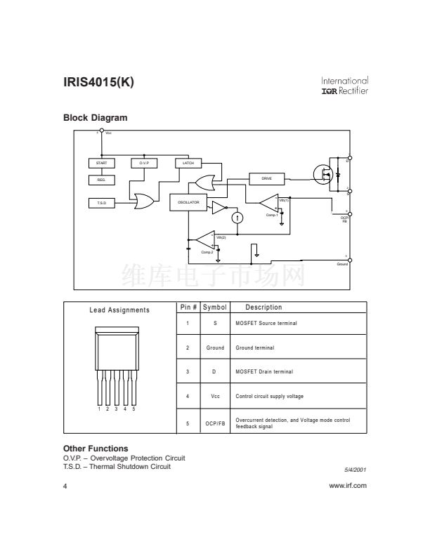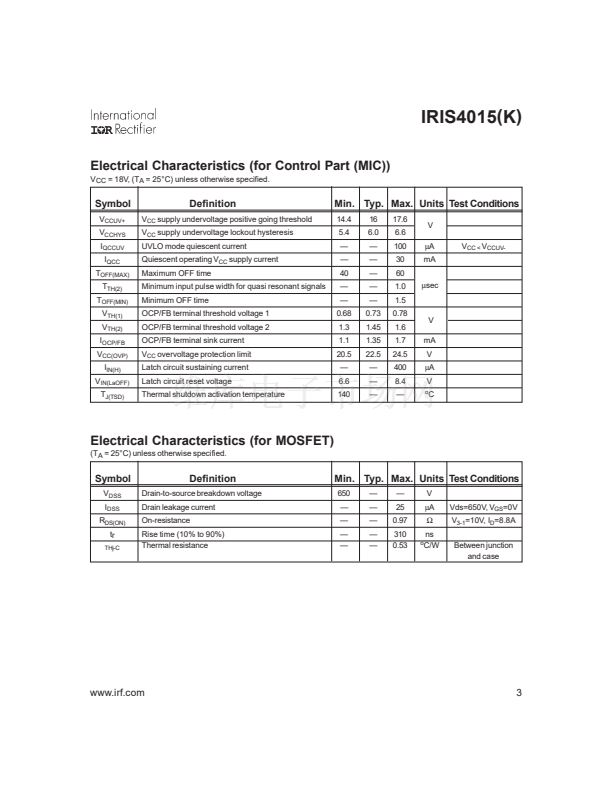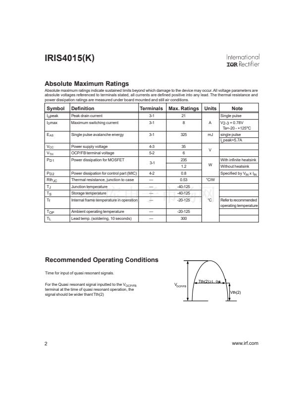 The IRIS4015(K) is designed for use in AC/DC switching power supplies up to 230VAC nominal input, and is