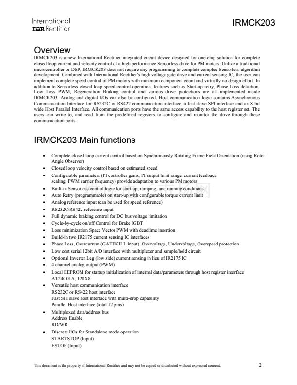 IRMCK203 is a high performance digital motion control IC for Sensorless AC permanent magnet motor application. Control is