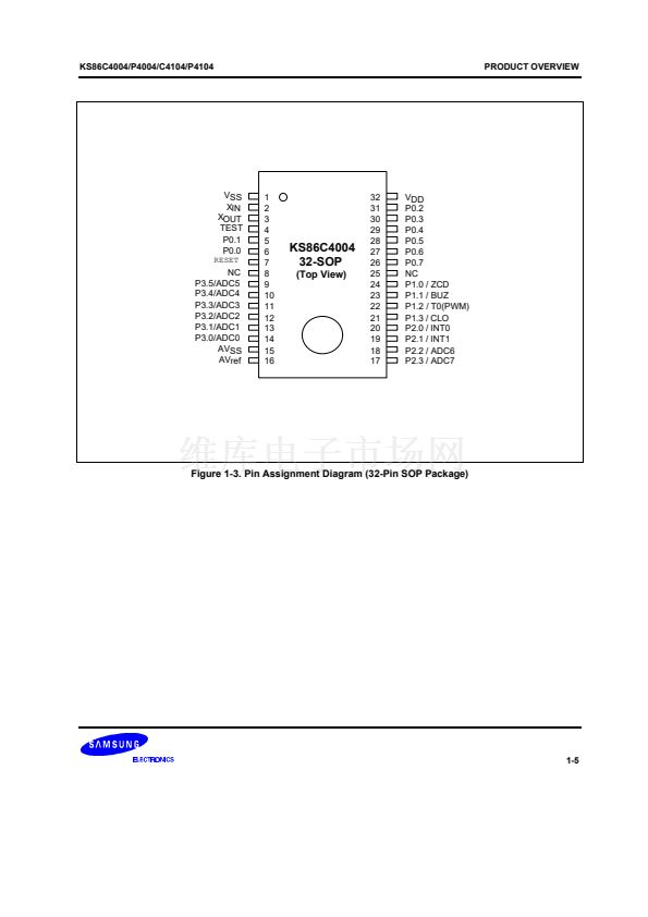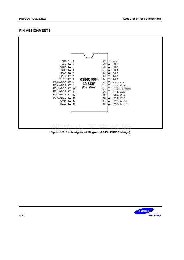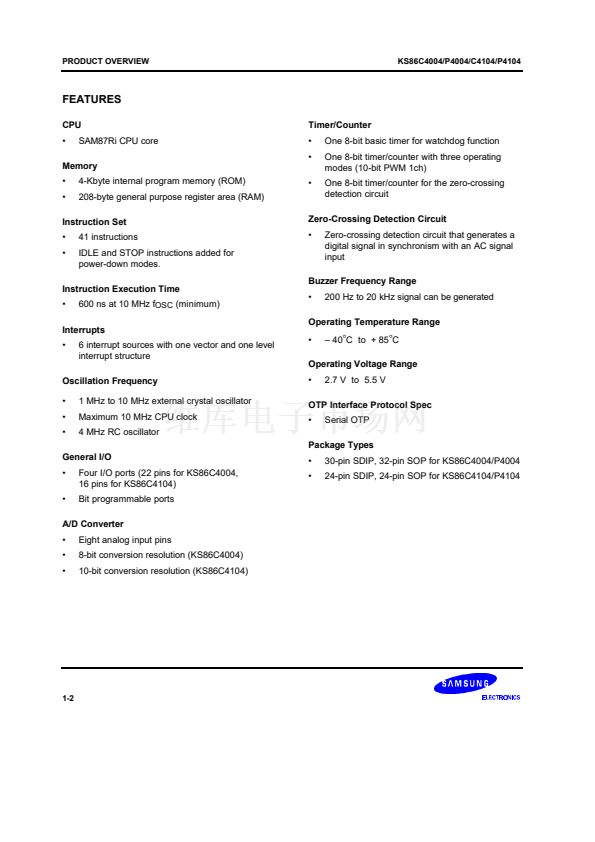 timer/counter, PWM, ADC, ZCD and capture functions. KS86C4004 is available in a 30-pin SDIP and a 32-pin