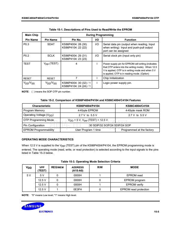 KS86P4004/P4104 is fully compatible with the KS86C4004/C4104, in function, in D.C. electrical characteristics