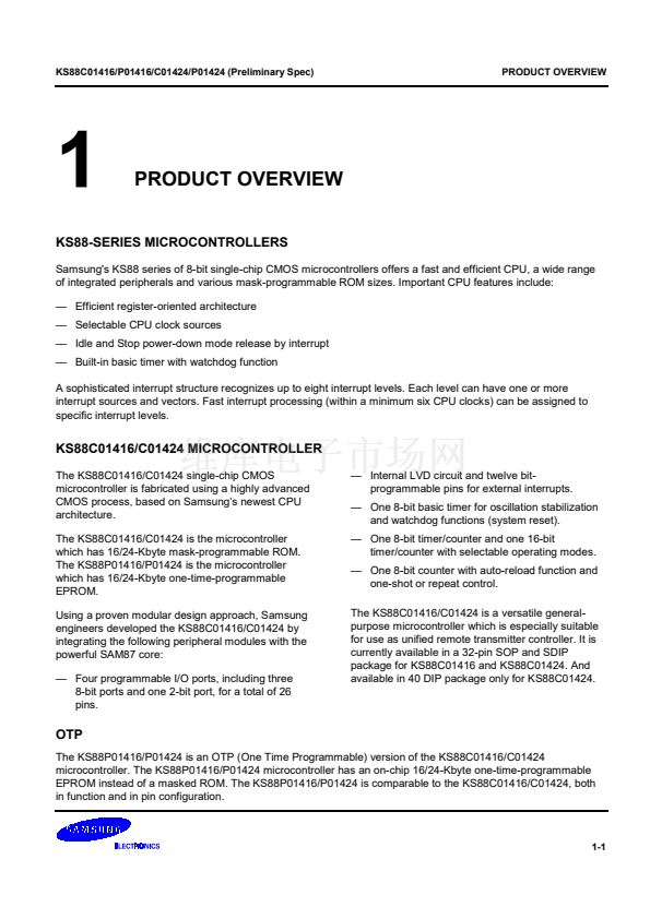 microcontroller. The KS88P01416/P01424 microcontroller has an on-chip 16/24-Kbyte one-time-programmable