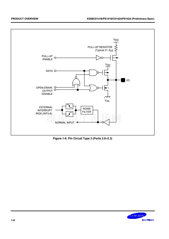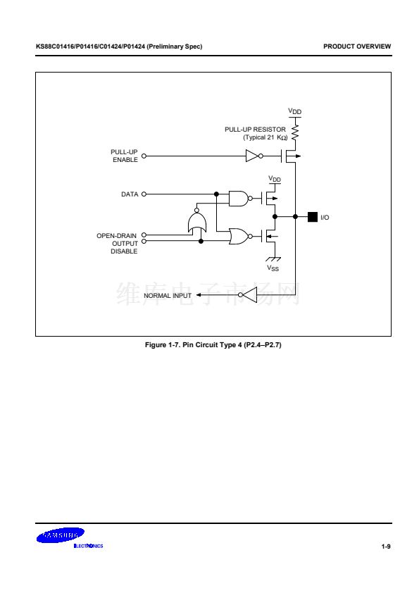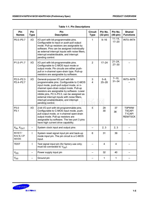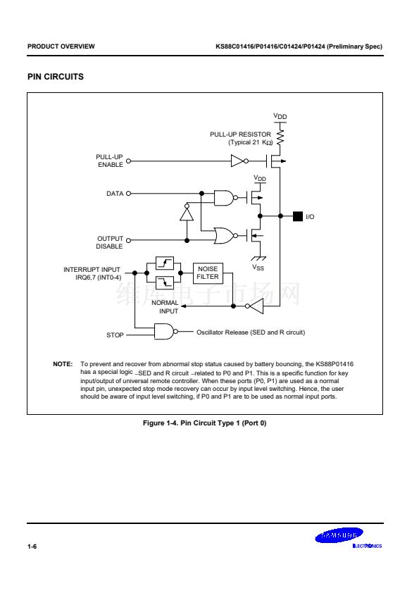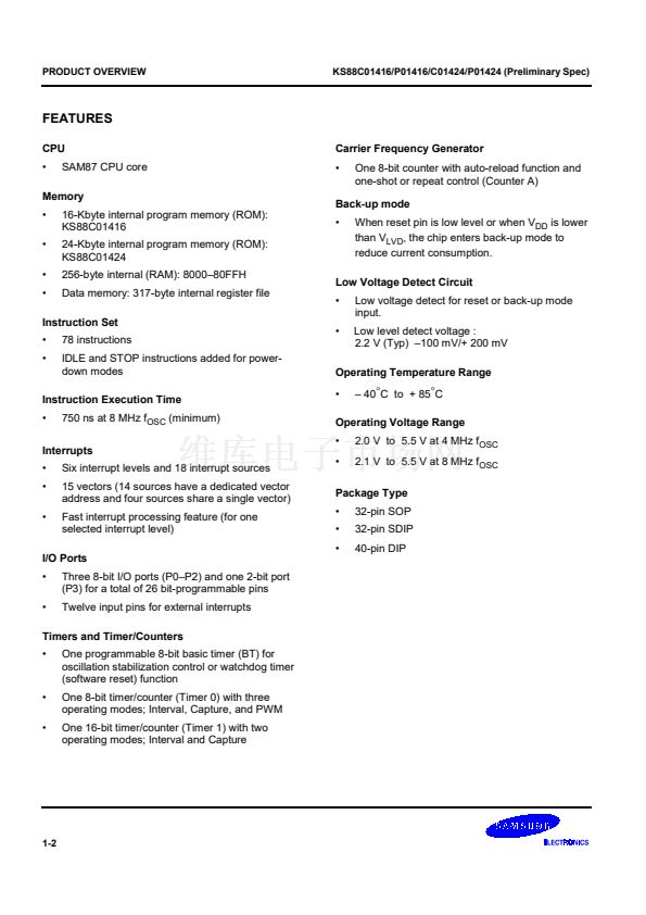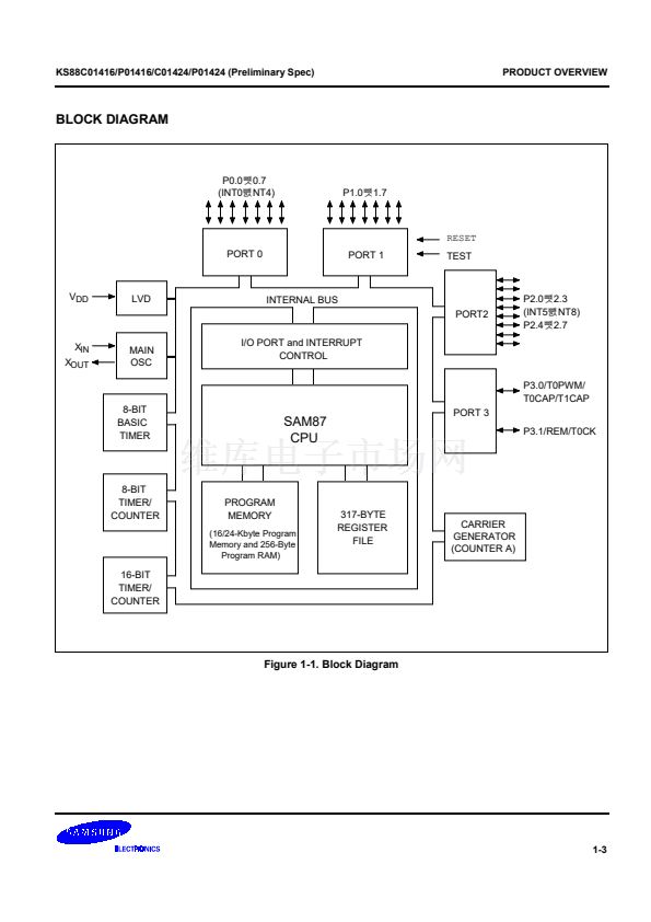 EPROM instead of a masked ROM. The KS88P01416/P01424 is comparable to the KS88C01416/C01424, both