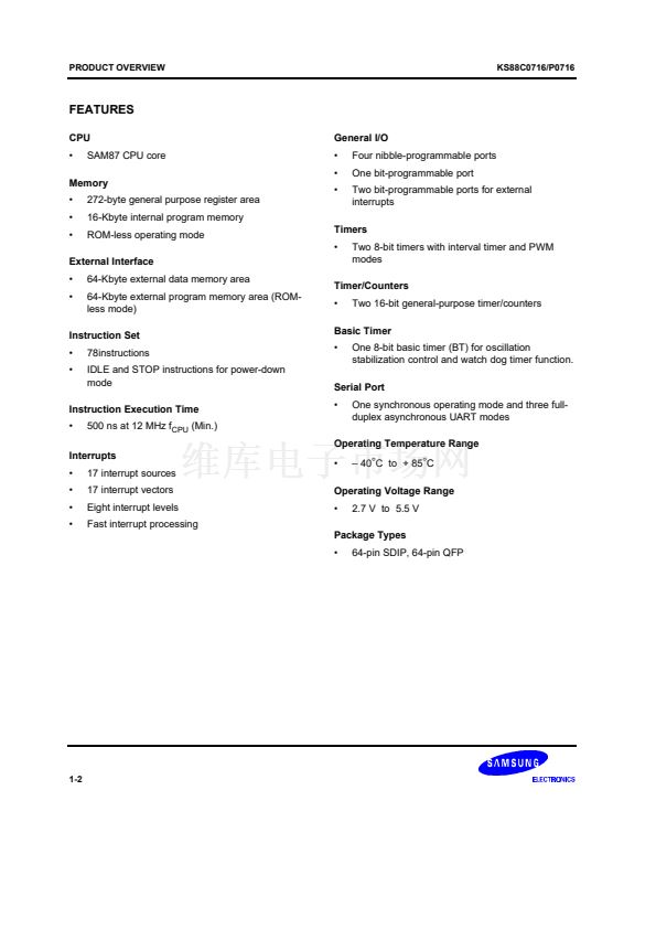 KS88C0716/P0716 single-chip 8-bit microcontrollers are based on the powerful SAM87 CPU architecture. The