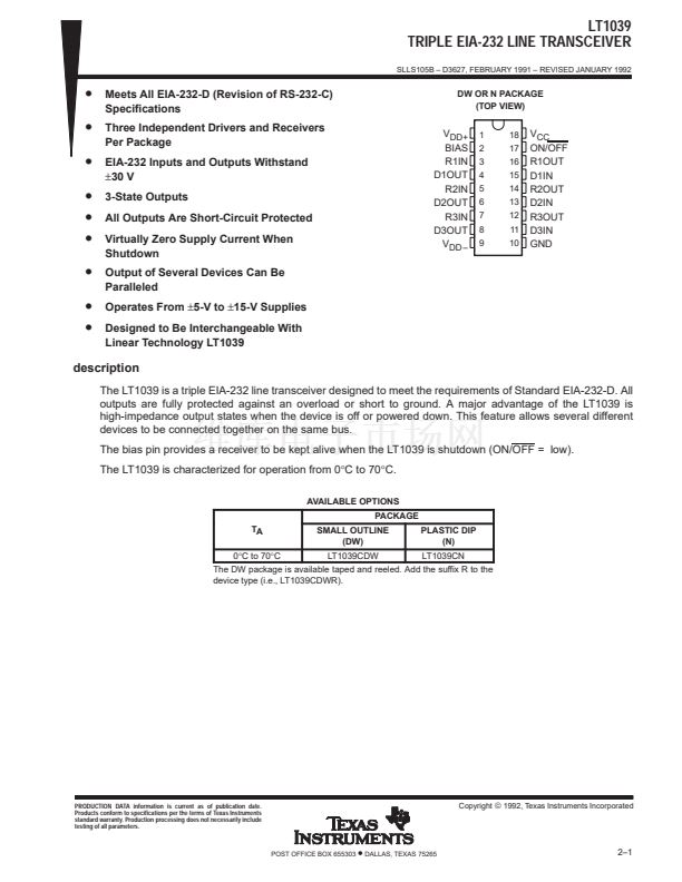 The LT1039 is a triple EIA-232 line transceiver designed to meet the requirements of Standard EIA-232-D. All