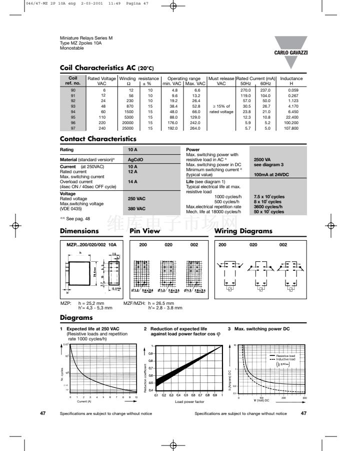 • Miniature Relays Series M Type MZ 2 poles 10A Monostable