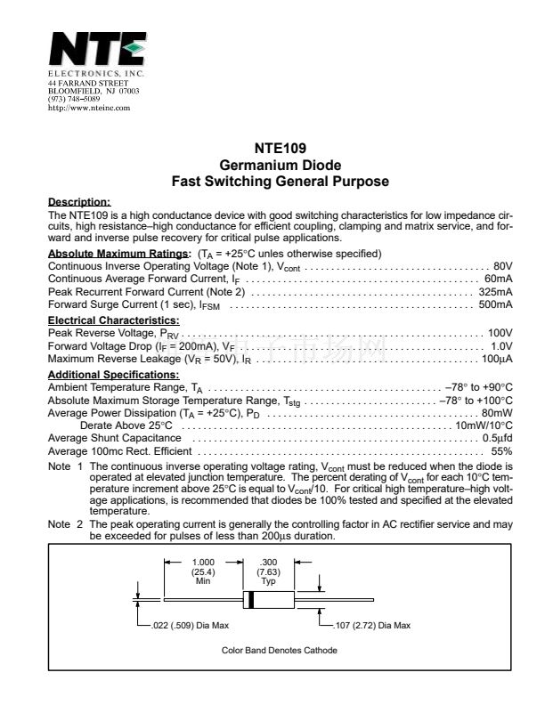 The NTE109 is a high conductance device with good switching characteristics for low impedance cir-