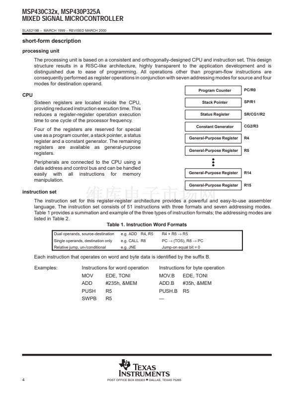registers on the CPU, and a constant generator, the MSP430 achieves maximum code efficiency. The digitally-