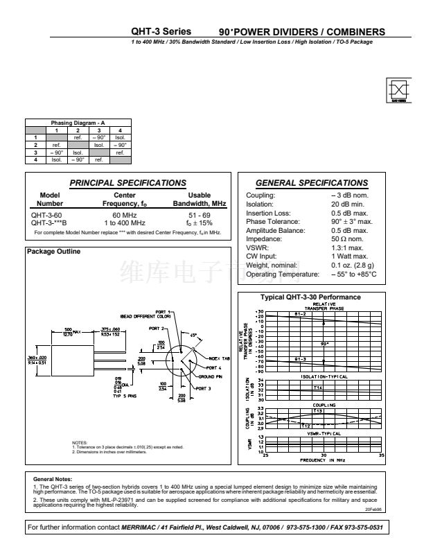 1. The QHT-3 series of two-section hybrids covers 1 to 400 MHz using a special lumped element design to minimize size while maintaining