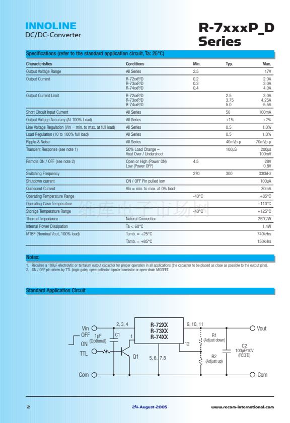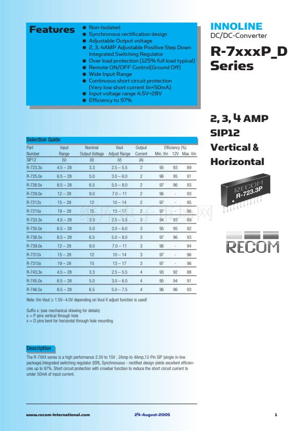 The R-7XXX series is a high performance 2.5V to 15V , 2Amp to 4Amp,12-Pin SIP (single in-line
