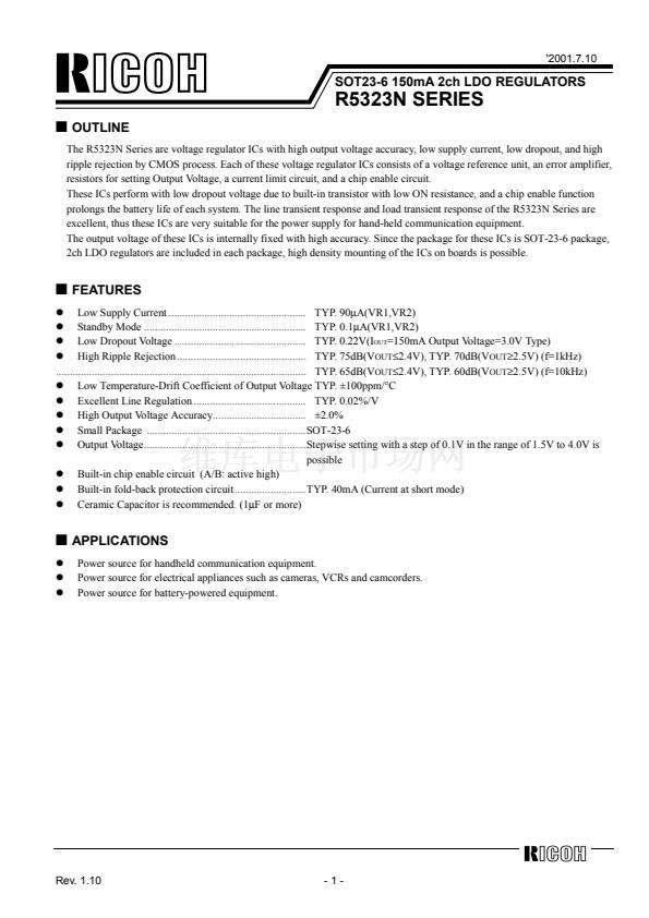 The R5323N Series are voltage regulator ICs with high output voltage accuracy, low supply current, low dropout, and high