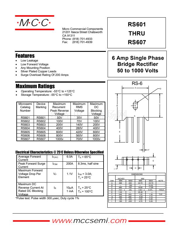 • 6 Amp Single Phase Bridge Rectifier 50 to 1000 Volts