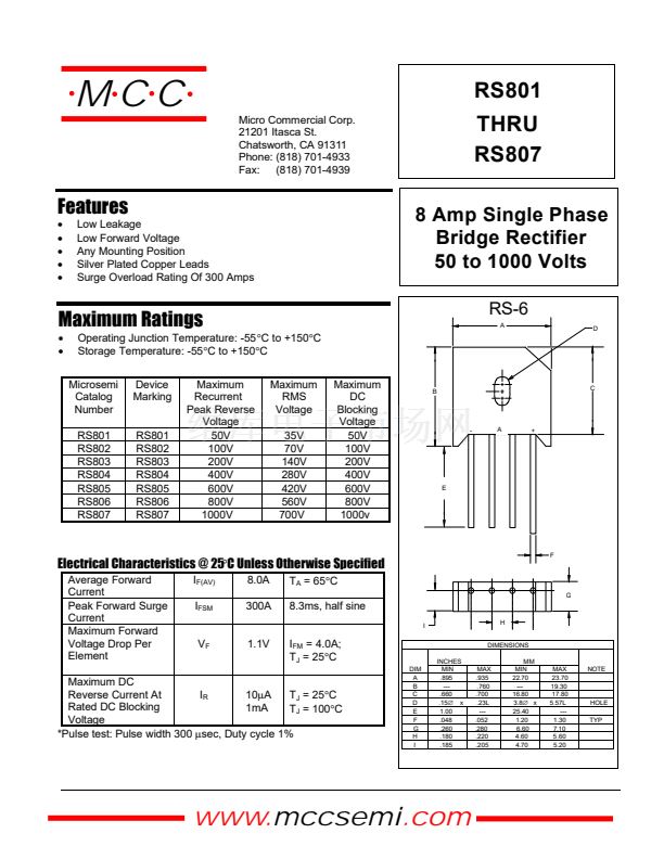 8 Amp Single Phase Bridge Rectifier 50 to 1000 Volts