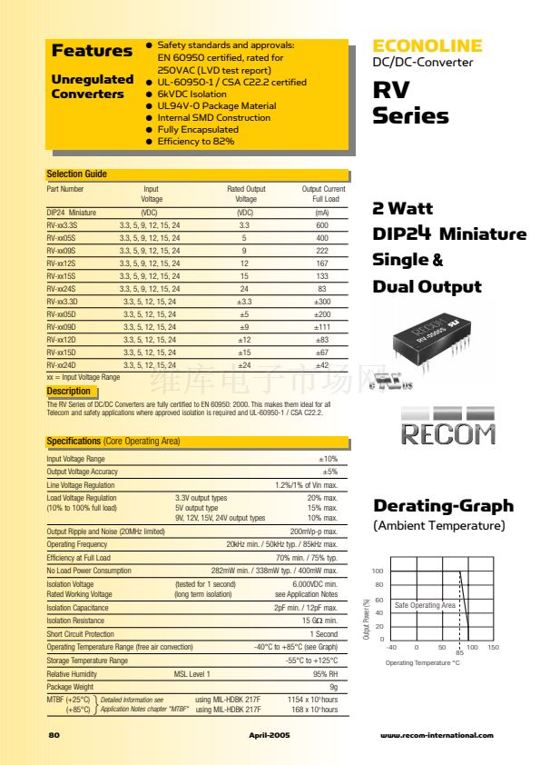 The RV Series of DC/DC Converters are fully certified to EN 60950: 2000. This makes them ideal for all