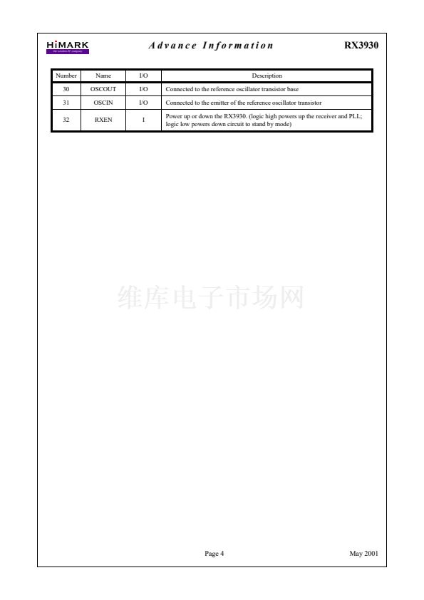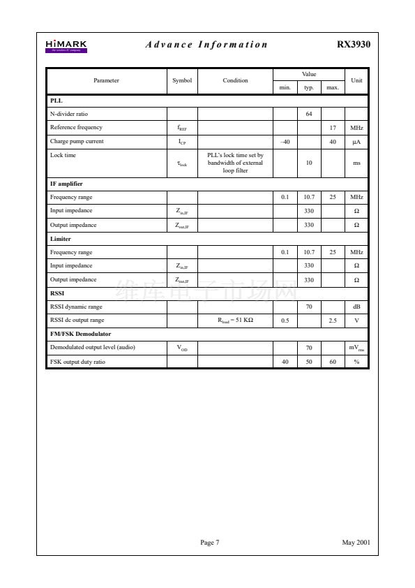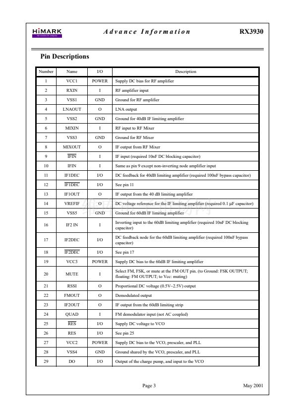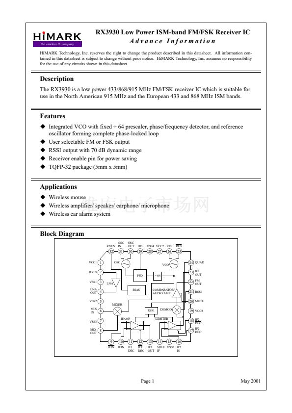 RX3930 Low Power ISM-band FM/FSK Receiver IC