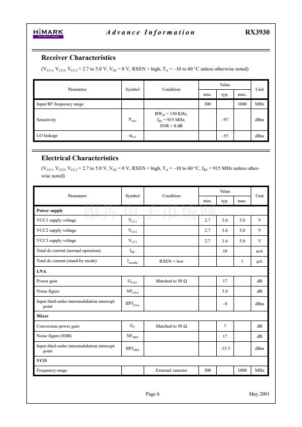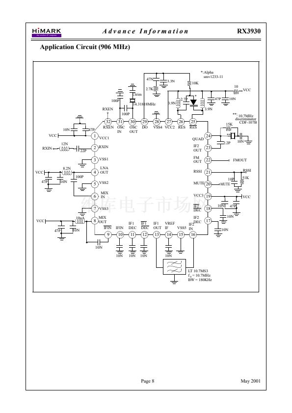 The RX3930 is a low power 433/868/915 MHz FM/FSK receiver IC which is suitable for