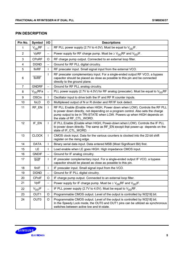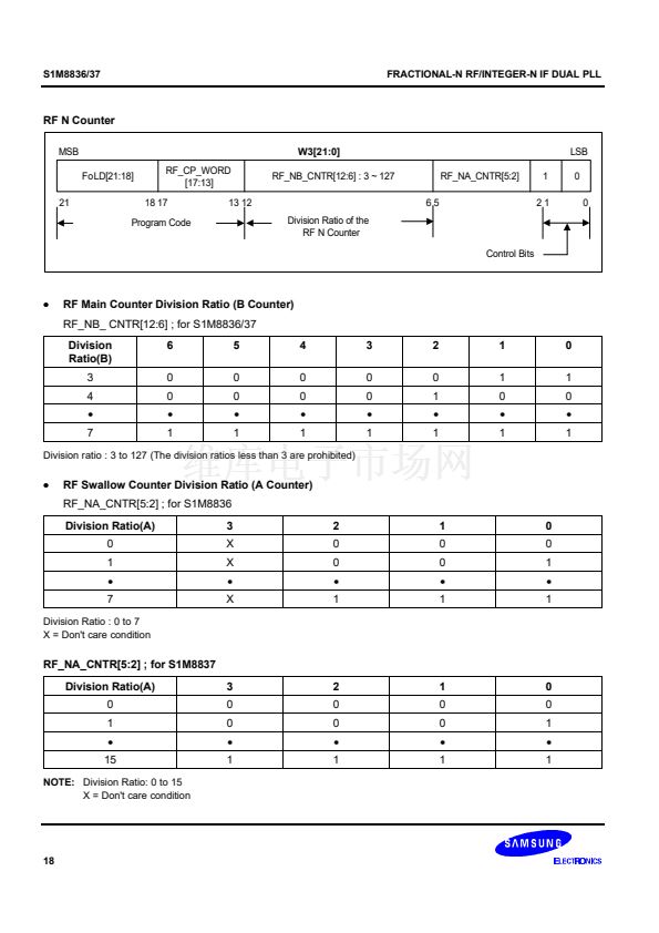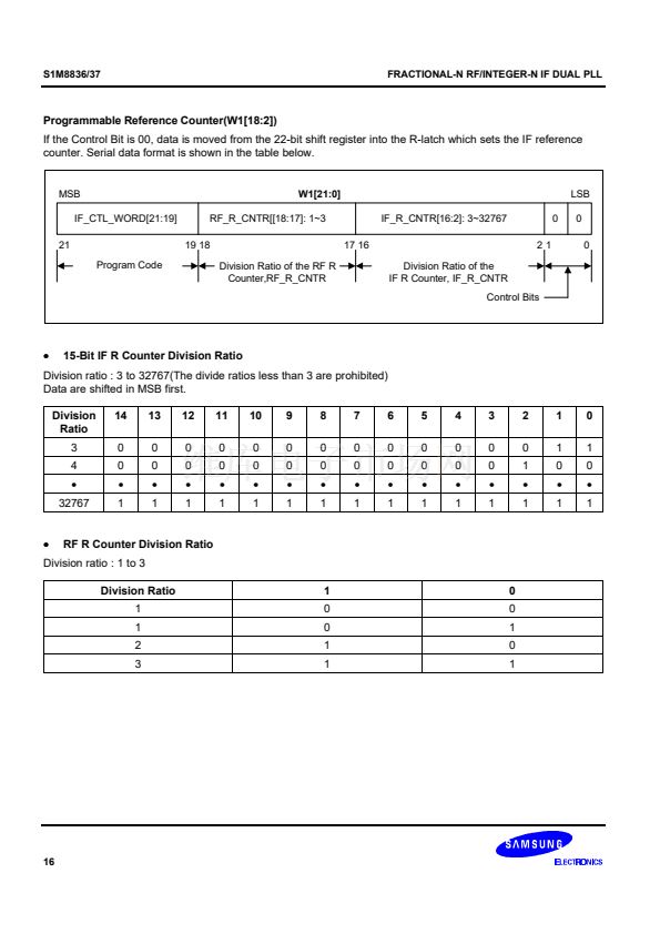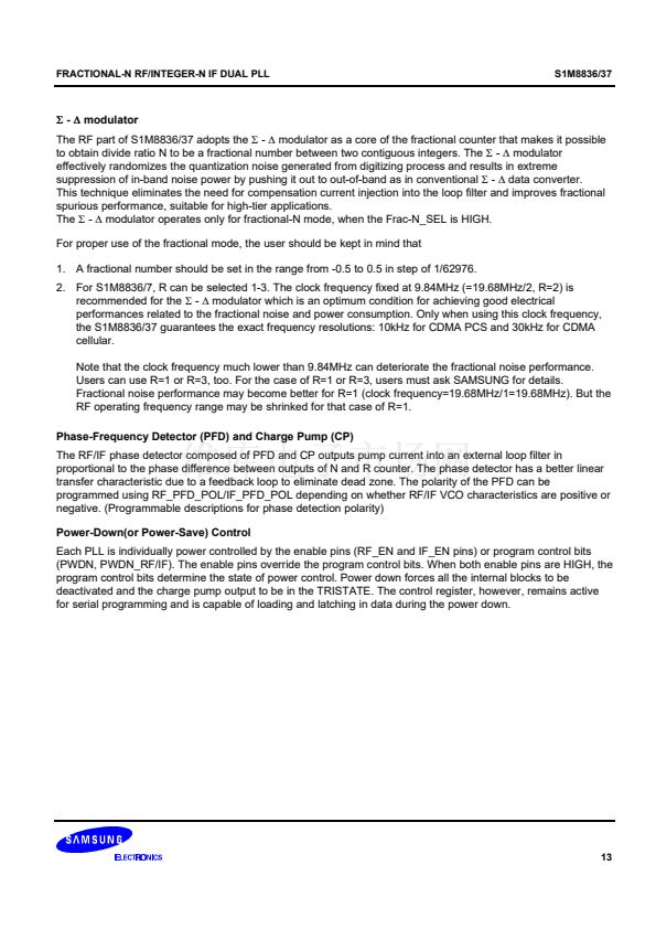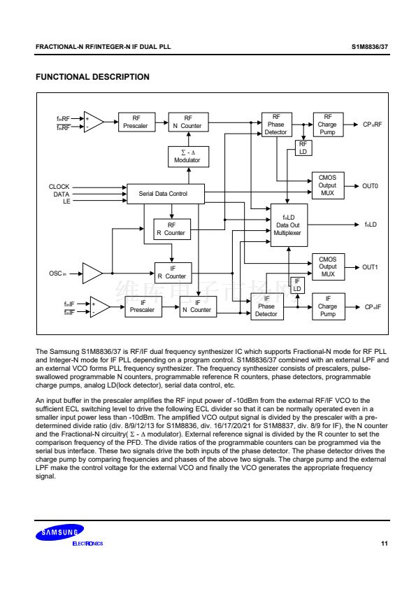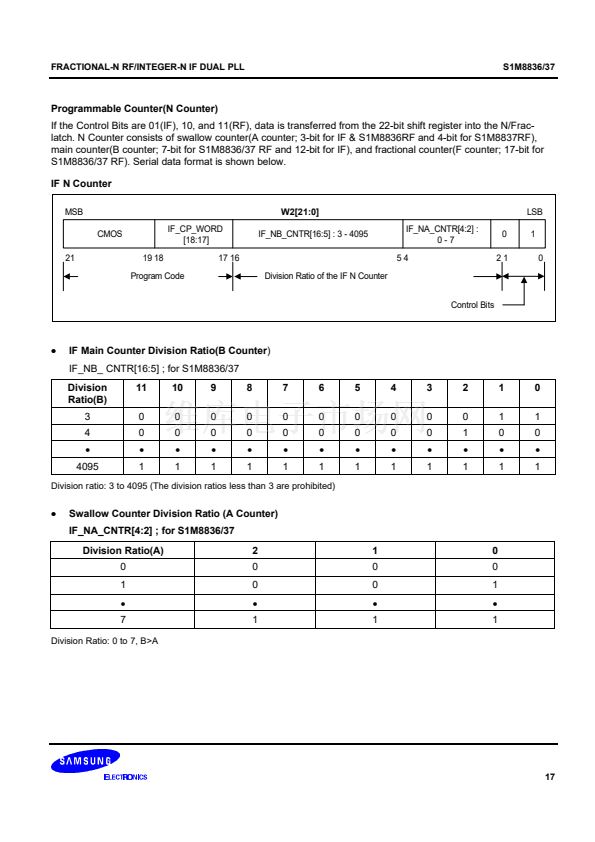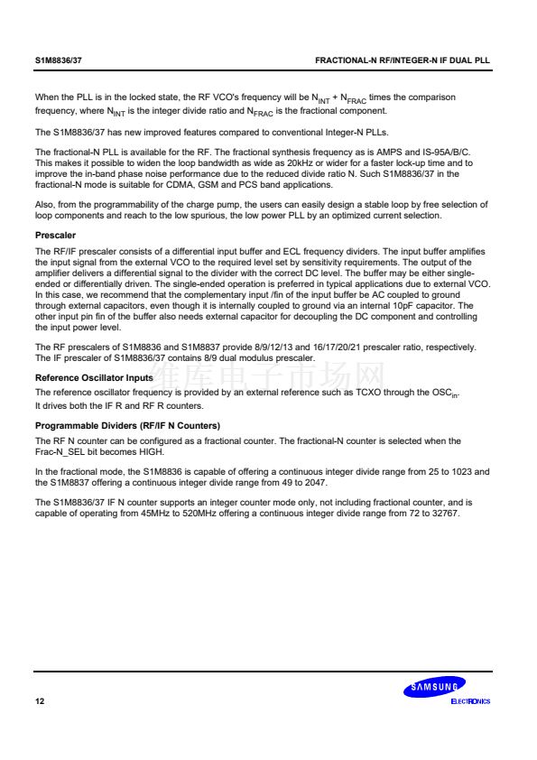 synthesizer adopts an 8/9/12/13 prescaler(16/17/20/21 for the S1M8837) and the IF synthesizer adopts an 8/9