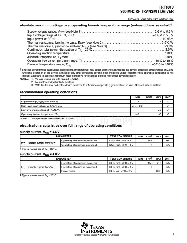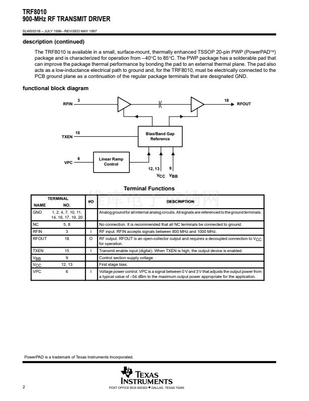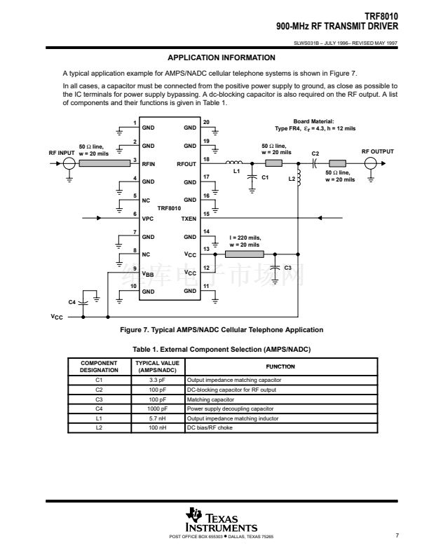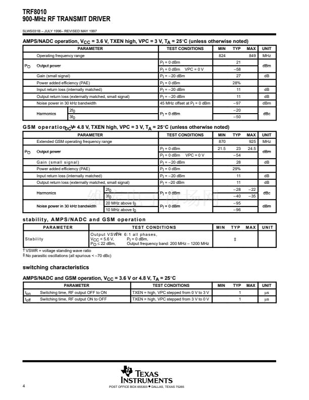 The TRF8010 is an RF transmit driver amplifier for 900-MHz digital, analog, and dual-mode communication