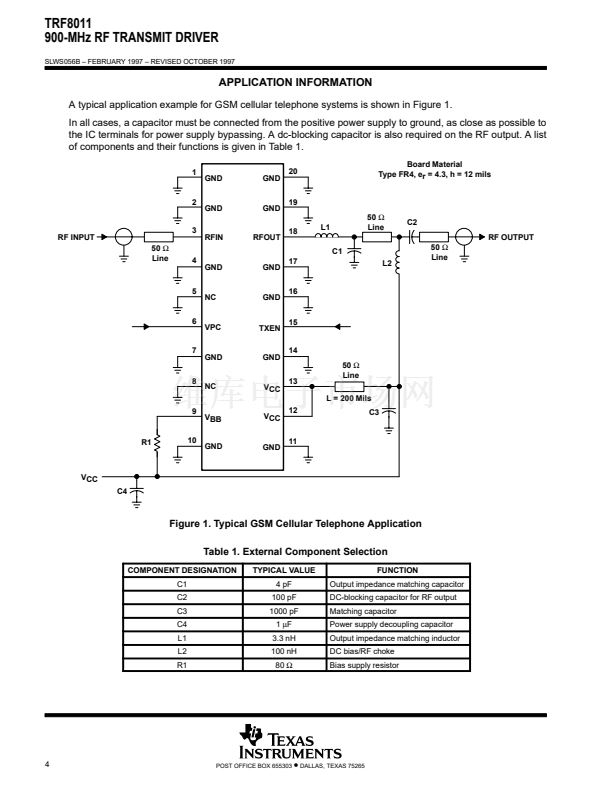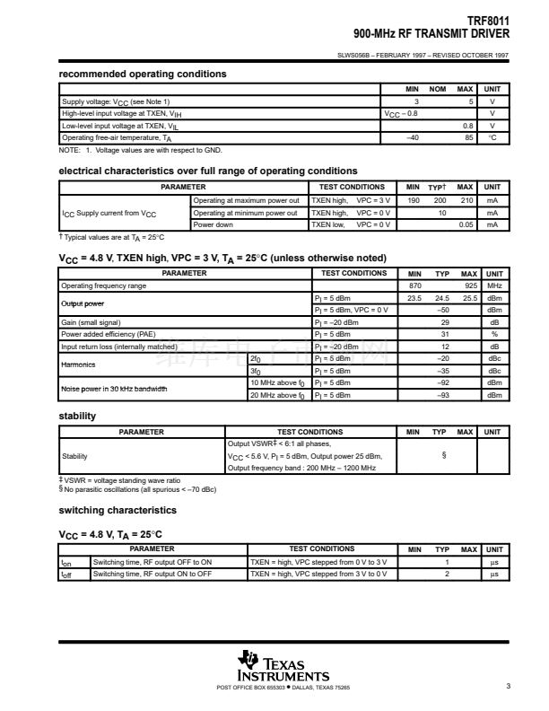 The TRF8011 RF transmit driver amplifier is for use in 800 to 1000 MHz wireless communication systems. It