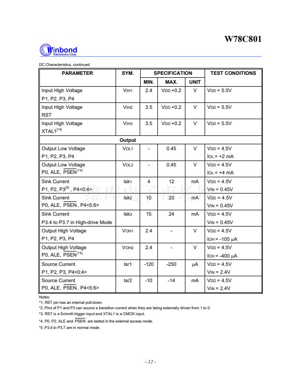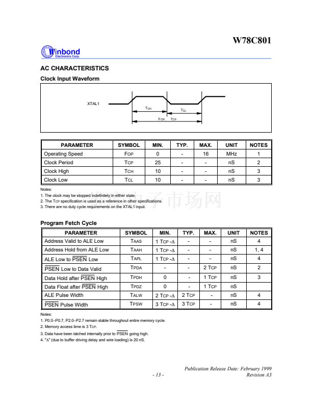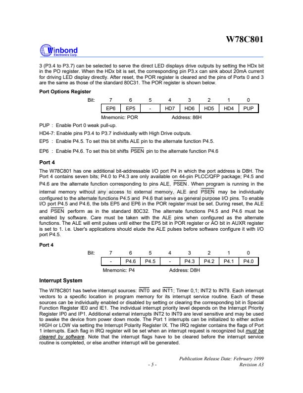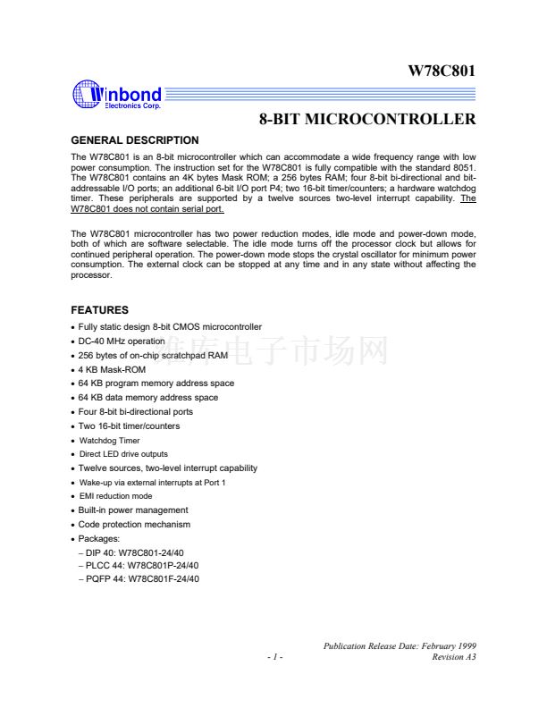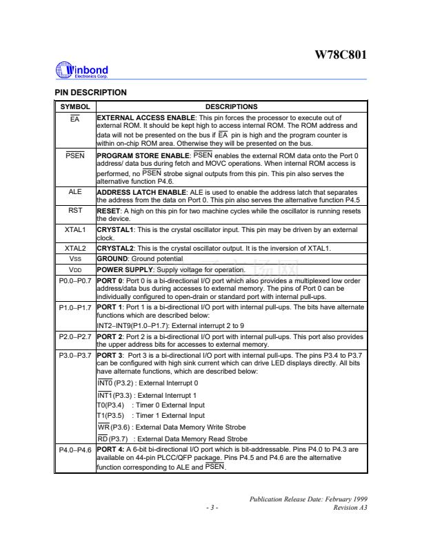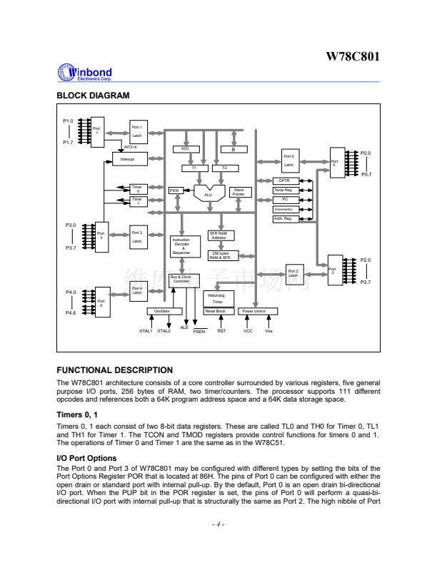 The W78C801 contains an 4K bytes Mask ROM; a 256 bytes RAM; four 8-bit bi-directional and bit-
